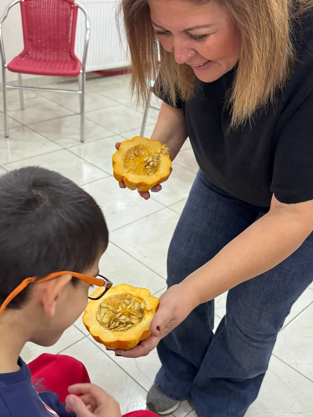 Etkinlik sürecinde çocuklar bal kabağını yalnızca bir sebze olarak değil; değişim, değer, farklılık ve öz gibi kavramları düşündüren bir başlangıç noktası olarak ele aldılar. P4C (Çocuklar için Felsefe) yaklaşımıyla yürütülen sohbetlerde, çocuklar merak ettikleri soruları özgürce sorma ve kendi düşüncelerini paylaşma fırsatı buldu.