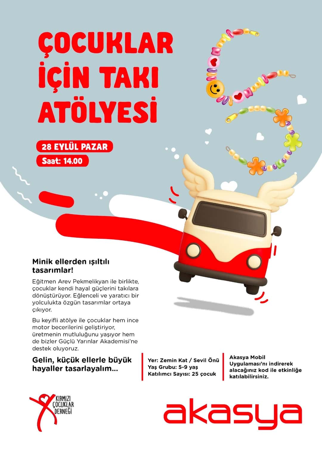 28 Eylül Pazar günü Akasya AVM’de minik eller hayallerini renklere ve boncuklara dönüştürdü. Akiş GYO sponsorluğunda ve Kırmızı Çocuklar Derneği iş birliğiyle düzenlenen Çocuklar İçin Takı Atölyesi, çocuklara hem keyifli bir deneyim hem de unutulmaz anılar sundu.