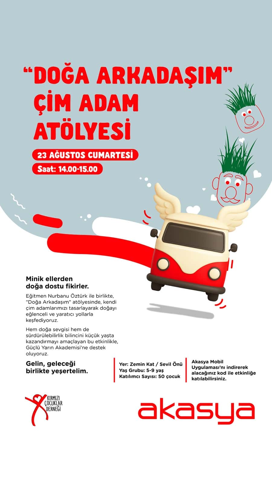 23 Ağustos Cumartesi günü Akasya AVM’de Akiş GYO sponsorluğunda gerçekleşen “Doğa Arkadaşım – Çim Adam Atölyesi”, minik doğa dostlarını bir araya getirdi. Etkinlikte, çocuklarımız kendi çim adamlarını tasarlayarak hem doğayı tanıdı hem de eğlenceli bir üretim deneyimi yaşadı.