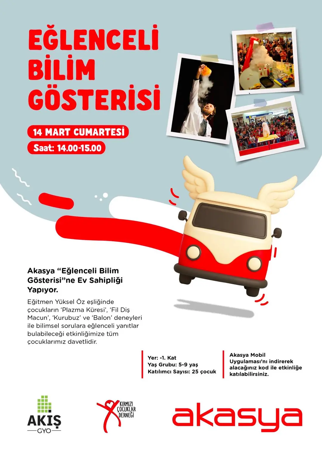 Kırmızı Çocuklar Derneği ve Akiş GYO işbirliğiyle Güçlü Yarınlar Akademisi kapsamında 14 Mart 2026 tarihinde Eğlenceli Bilim Gösterisi Akasya AVM’de çocuklarla buluştu. Uzman eğitmen Yüksel Öz eşliğinde düzenlenen programda çocuklar, bilimin eğlenceli ve merak uyandıran dünyasını deneyler aracılığıyla keşfetme fırsatı buldu.
