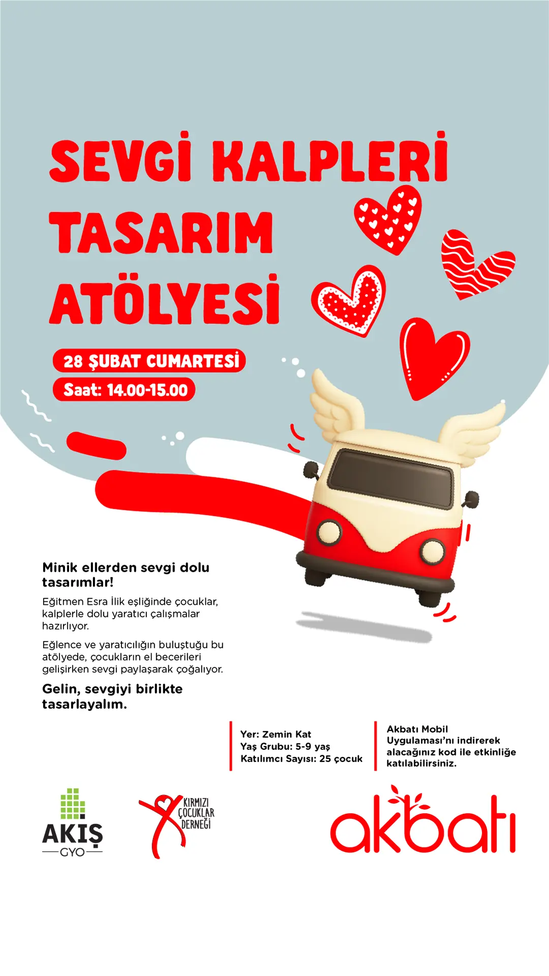 28 Şubat 2026’da Akbatı AVM’de düzenlenen Sevgi Kalpleri Tasarım Atölyesi, 5-9 yaş aralığında 14 çocuğun katılımıyla gerçekleştirildi.